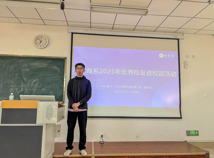 2025 年 11 月 19 日下午,体育系举办 2025 年优秀校友进校园活动,阶梯教室暖意融融、掌声阵阵。2022 级优秀校友谢志远重返母校,以一场干货满满的分享会,为学弟学妹们解锁大学生涯的奋斗指南,传递青春向上的力量。